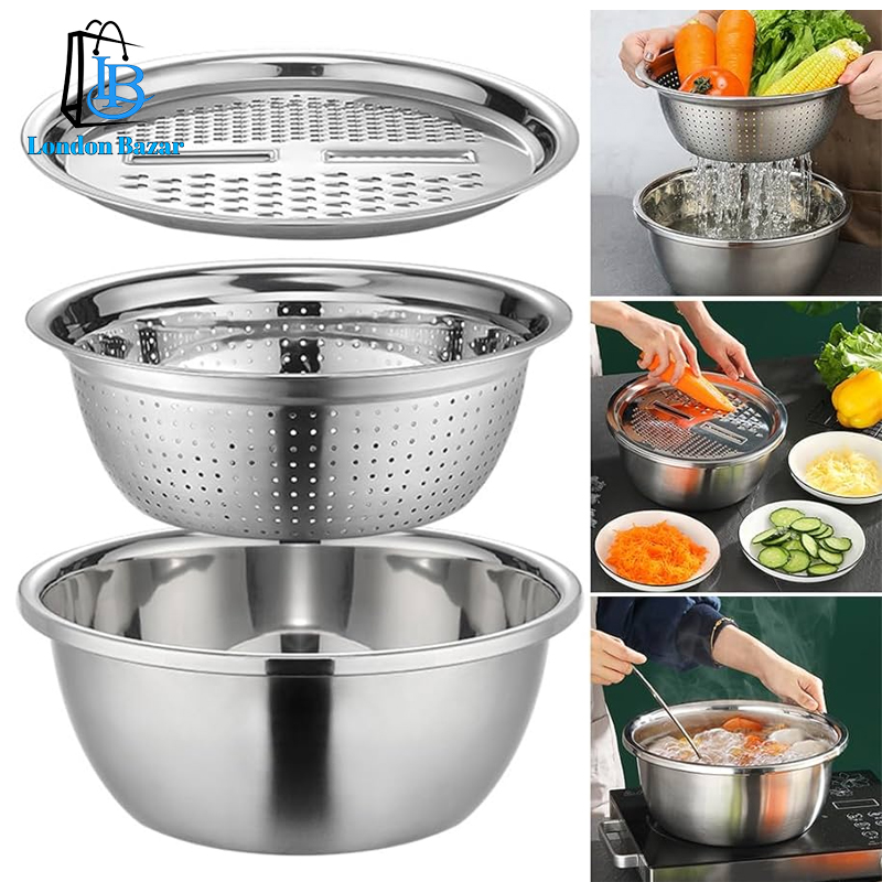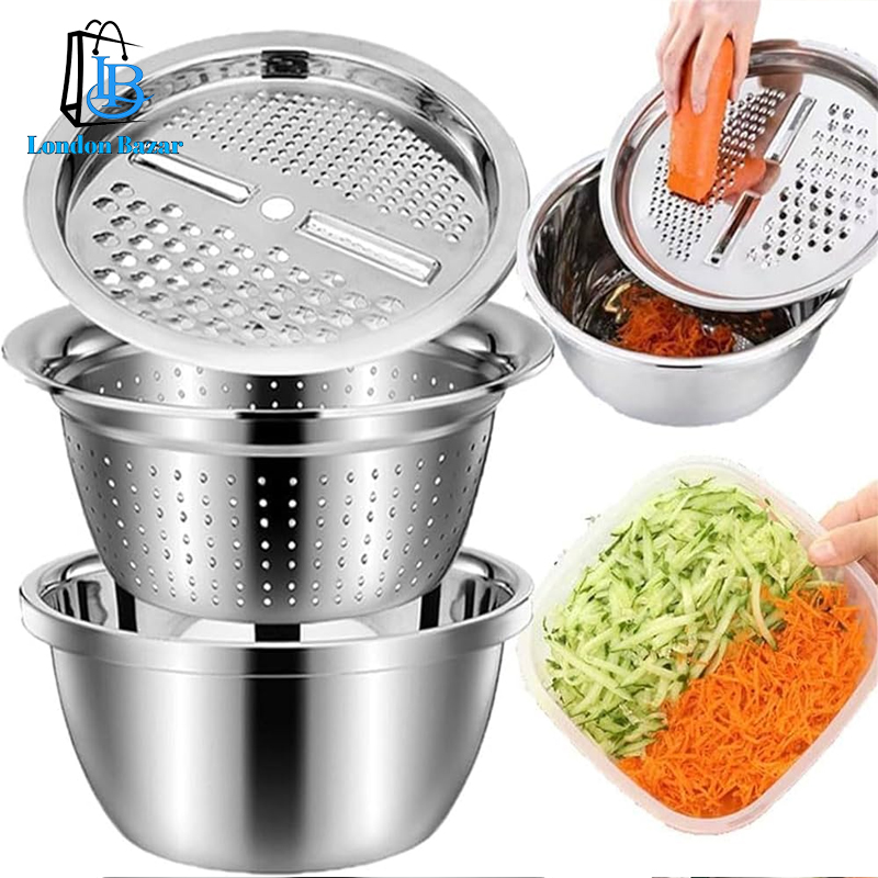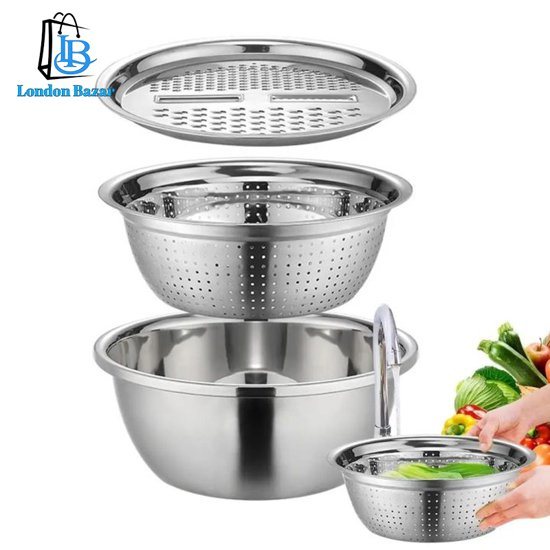 বেসিন/পাত্র (Mixing Bowl): সবার নিচে থাকা গভীর পাত্রটি। এটি সবজি কাটার সময় নিচে জমা হওয়ার জন্য বা সরাসরি রান্না করার পাত্র হিসেবেও ব্যবহার করা যেতে পারে (কিছু ক্ষেত্রে)।