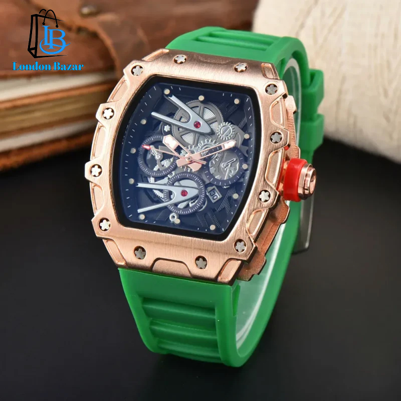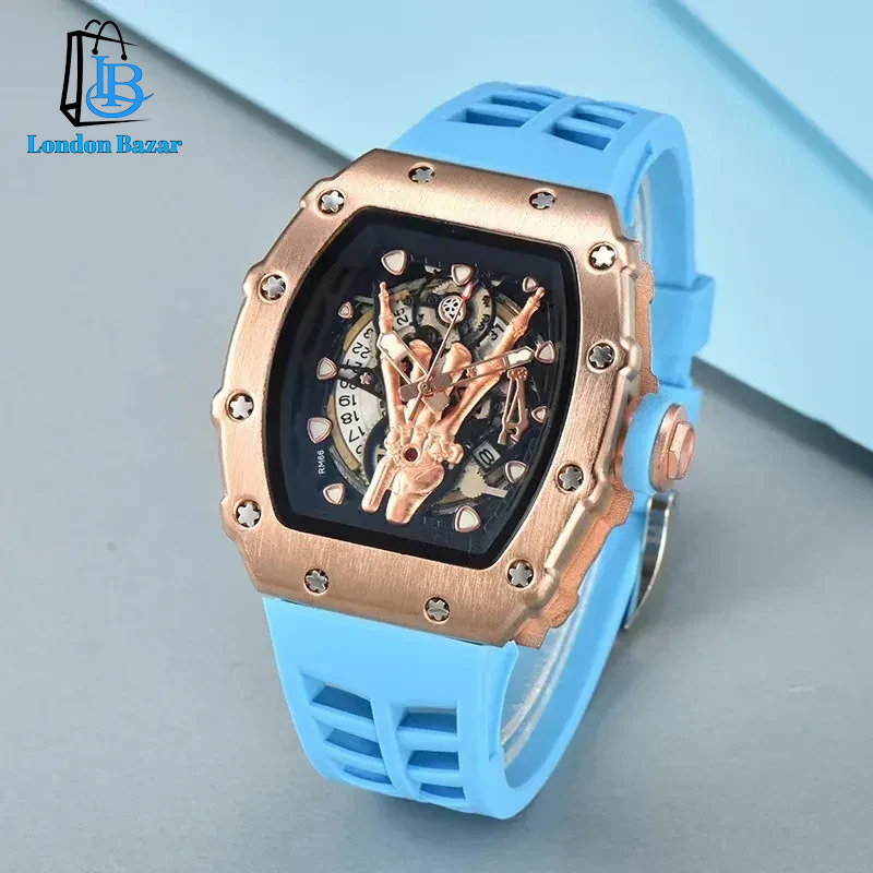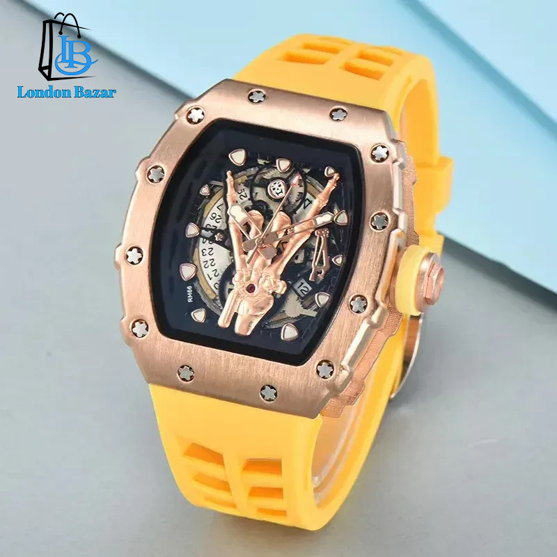 কেস (Case) ডিজাইন: এটি একটি 'টোনো' (Tonneau) বা ব্যারেল-আকৃতির কেস, যা বিলাসবহুল স্পোর্টস ঘড়ি, যেমন Richard Mille-এর ডিজাইনের অনুকরণে তৈরি। কেসটিতে বোল্ট বা স্ক্রু-এর মতো দেখতে ধাতব ডিটেইল ব্যবহার করা হয়েছে।